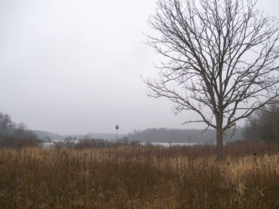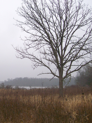 Here is my reference photo. I took this picture in November at the Little Red Schoolhouse as I was walking to the Black Oak Trail. There are many things I am in love with in this picture: the misty background over Long John Slough, the blue hues in the background, the red and amber colors in the field, and that wonderful winter tree standing solemn in the midst of it all.