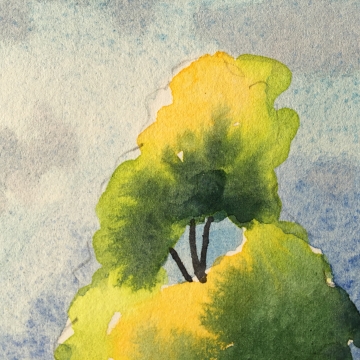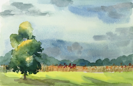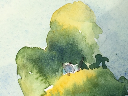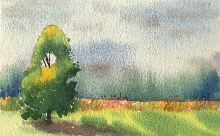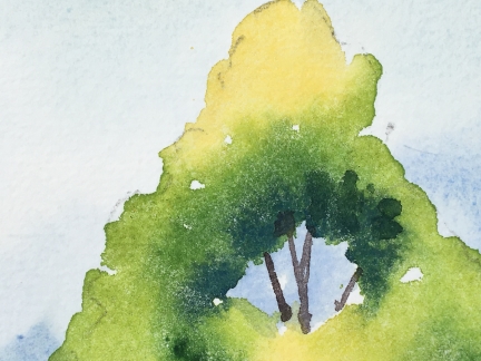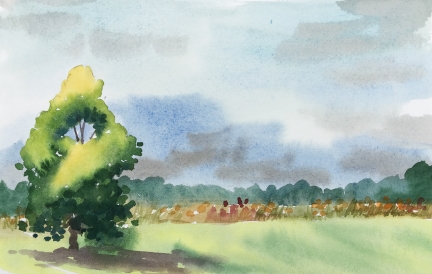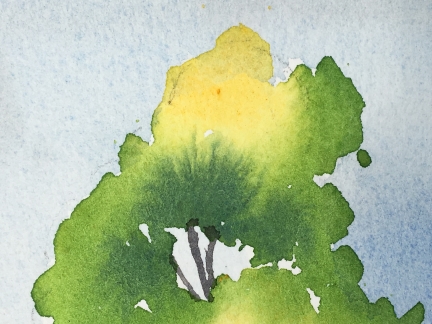 The paper itself has a cold press texture but the texture isn’t uniform or repeating. It accepted my graphite sketch with very little pressure. The sky was done wet on wet, which means I pre-wet the sky with clean water before I applied my color. When I applied my color, the pigments spread fast and fluid. The colors blended together well  and I did not have to soften the edges. The tree was done wet on dry, which means I painted the tree directly on dry paper. The colors blended effortlessly (see close up photo). This tells me that the paper isn’t drying fast and my pigment is soaking in . The paper stayed wet a fair amount of time. The ultramarine blue in the sky has slight granulation showing on the paper. The paper did buckle as I was painting, however dried almost completely flat in the end.