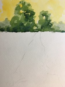 Step 1: Draw a road map with a pencil. Don’t include detail. I just marked a horizon line, a stream, and a few trees in the background.
