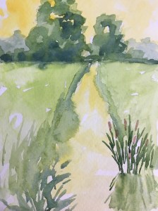With a dark green/blue and the edge of the flat brush, paint vertical cattail grasses on the right side of the stream. Wet the paper under the cattails and pull some color down as a reflection. Then with a little brown, paint the cattails. On the left make thicker grasses for some summer flowers. Nice and loose…..do not mind the form.