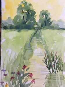 Step 7: I added some green to the furthest point in the stream to represent reflections. Next add some summer flowers. Today I saw purple coneflower, black eye Susan, and purple bergamot, but not in this location. That’s okay….I’ll just add it here to remember what was in bloom on this hot summer day. I added these blooms with a liner, not a flat brush. Next, add some tree branches to your large trees with sepia brown. Finally using light green, make horizontal water lines in the creek.