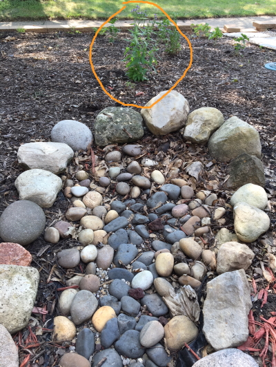 It’s difficult to see but the baby blue vervain plant is circled in orange at the end of the dry stream bed.