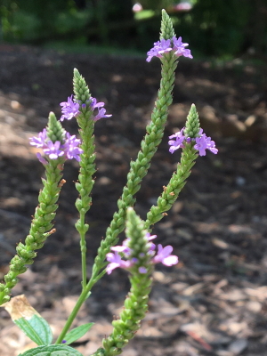 Today blue vervain (Verbena hastata) is in bloom in the native garden. I absolutely love its flowers. Up close they look blue-purple. From a distance they look purple to pinkish-purple. The actual flower itself is tiny but grows in clusters on a spike. They start blooming at the bottom and work their way upward.