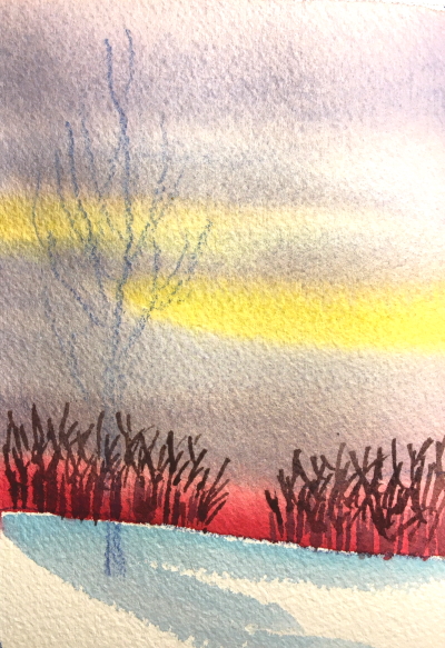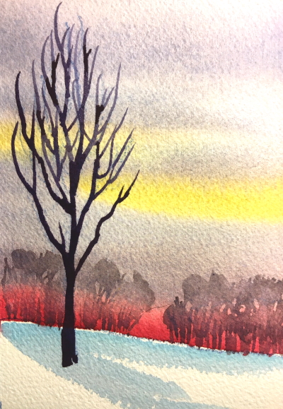 I hope you enjoyed this free step by step demonstration on how to paint a winter sunset using watercolors. This painting doesn’t take a long time, especially if you keep it small. You can do it! My painting was only 3.5×5″ and I’m using it for a Christmas card.