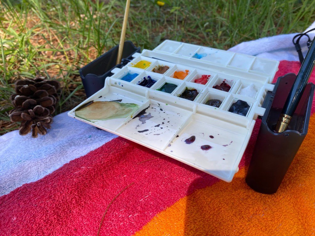 I was very excited to try my new toy, the Portable Painter (this is not sponsored, btw). It’s a compact mini watercolor field kit that fits on your leg. It has two water containers that slide on the sides of the kit. The water containers fit perfectly on your thigh. This is great because one of the challenges when painting in the field is trying to hold everything in one hand while painting with the other hand. I was laying on the ground with it on my leg, but you can also sit on a camping chair with it. Convenient!
