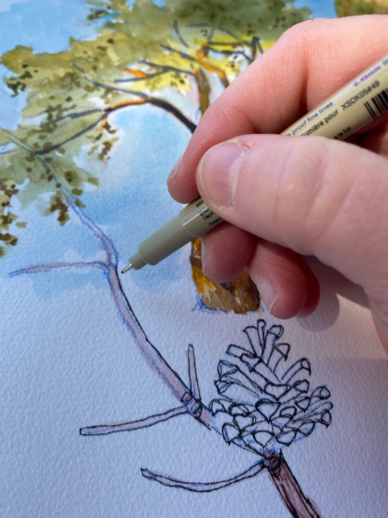 I found one of its cones still attached to a branch and decided to make an ink detail. I like its spiky tips. I’m spiky, but only in the morning.