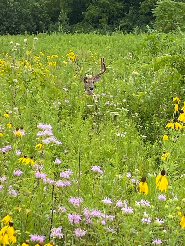 Last week I ran a nature summer camp for children that focused on wetlands and the animals that live in and around them. As we hiked to the river, one young camper spotted this gorgeous male, white-tailed deer (Odocoileus virginianus), hiding amongst the summer flowers. I had walked right passed him, less than a few feet away. Oblivious… So focused on presenting material…missing life right in front of me.