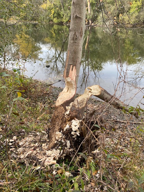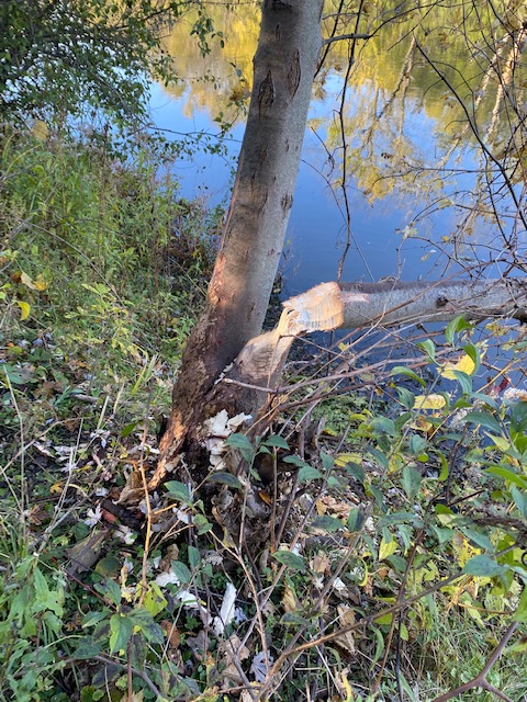 On or before October 26th, it chewed the smaller of the two trunks on this established tree next to the river. Then about two weeks later, it chewed the larger of the two trunks. Why did it not take the smaller one? I do not know.