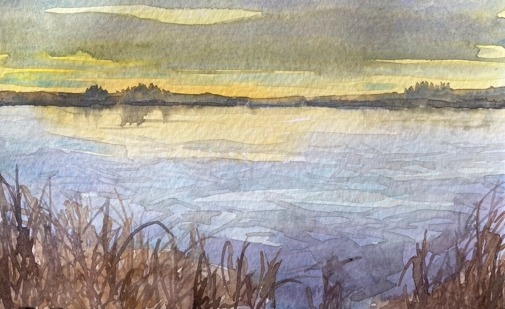 As I stand at the base of the pond, the tallest being in the field, the glacial gust goes through me too. I stare at the golden horizon for warmth. It’s fleeting though, succumbing to the palette of dusk.