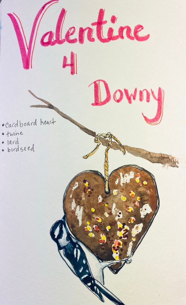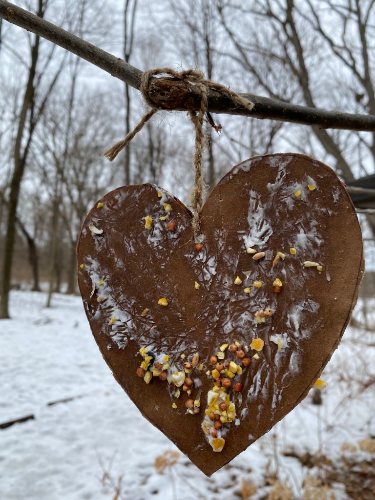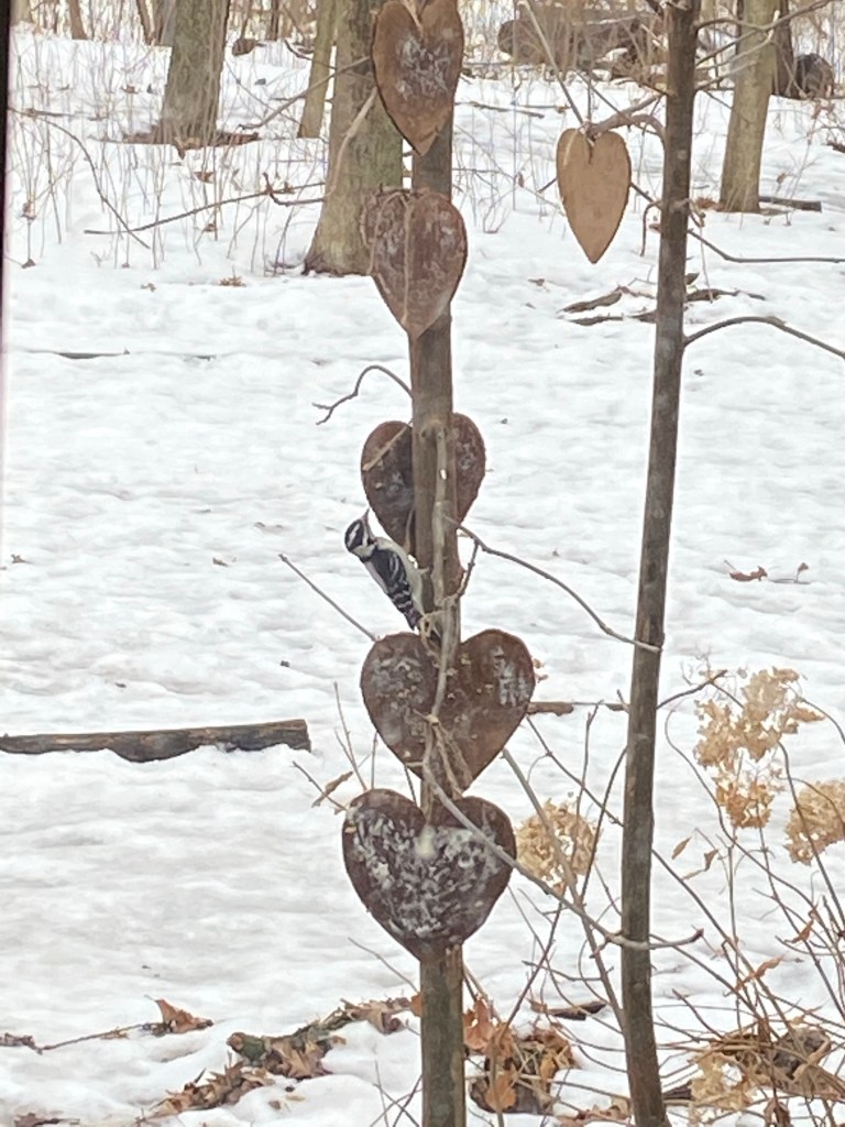 Even a female downy woodpecker likes getting a Valentine’s treat! Preschoolers decorated the woods with cute treats for the birds. The best part is that these treats are biodegradable, so if they blow off in the wind, no worries, they will decompose nicely.