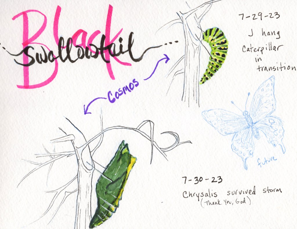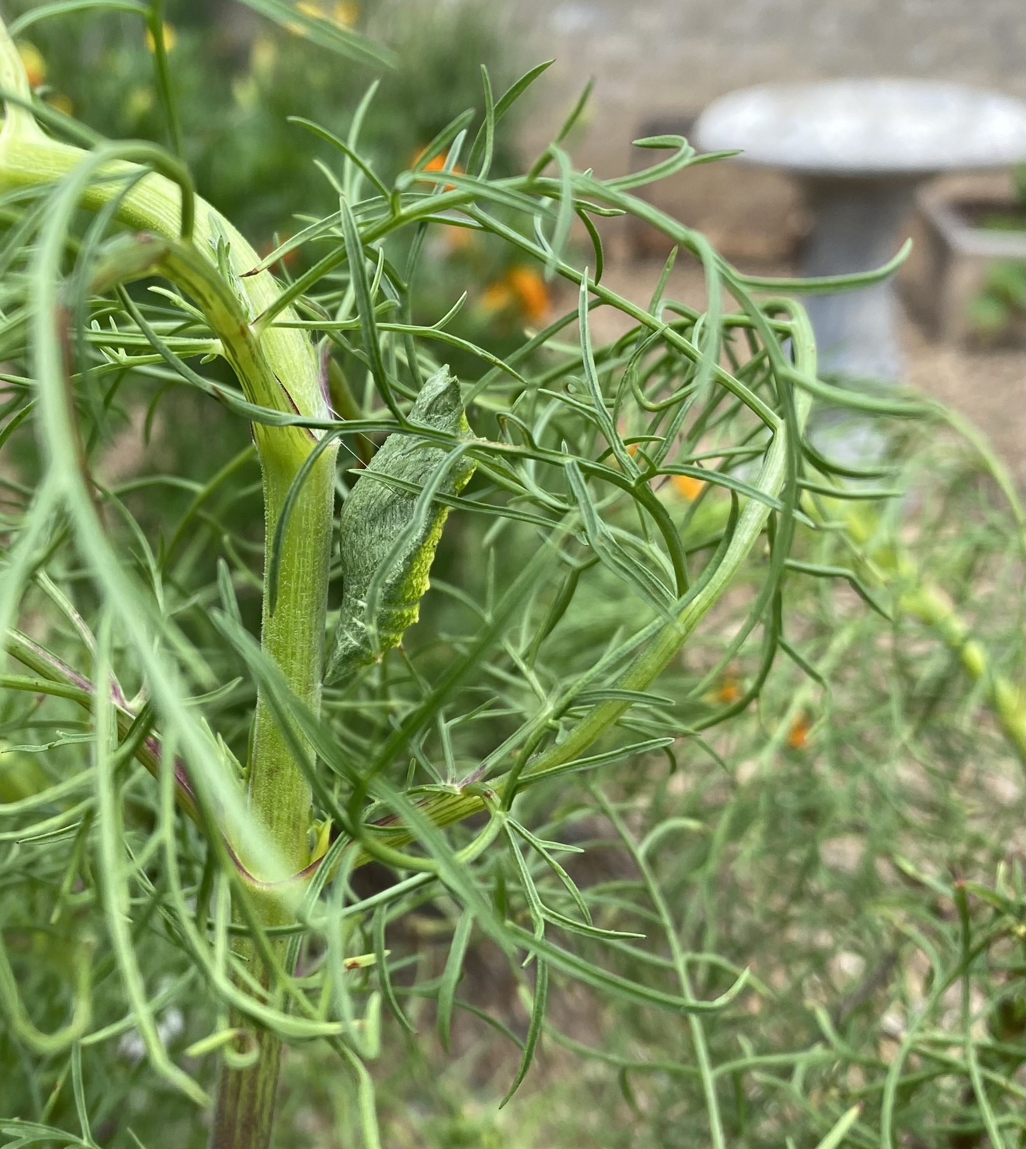 Yesterday I noticed a black swallowtail caterpillar on my cosmos plant. It was in a J-hang position, which signifies a transformation. At the time I saw it, I could no longer identify the feet and the end was already in a point formation. I could see two very thin, delicate silk threads holding the body. I backed away and left it in peace.