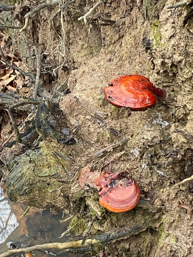 At the base of a felled tree, there were some amazing ruby-colored mushrooms. I do not know what species, but they were beautiful and even had streaks of blue and purple running throughout.