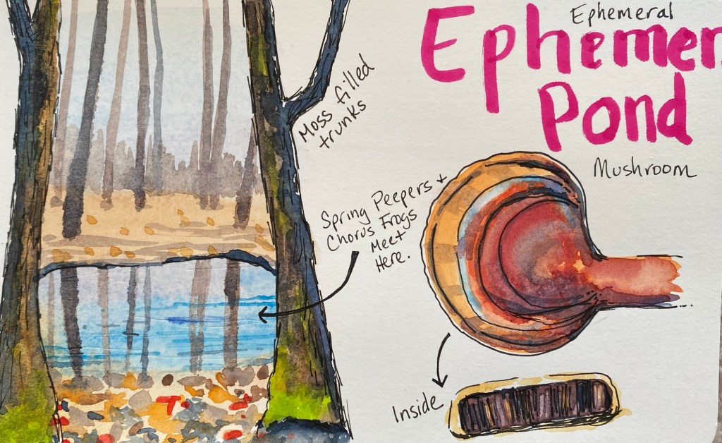 Perhaps at sunset, a spring peeper sits on one of these mushrooms above the water to call for a mate.