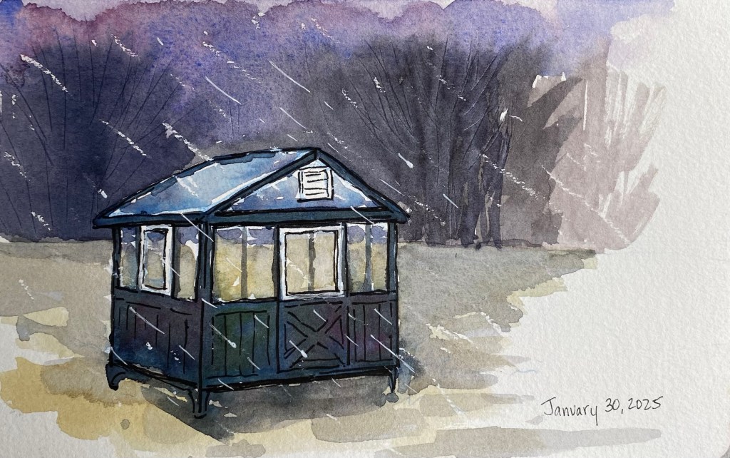 It’s 9 PM. I walk to the greenhouse to enjoy the pattering sounds of rain in the dark. Once inside, I notice leaks everywhere. The counters and floors are soaked.