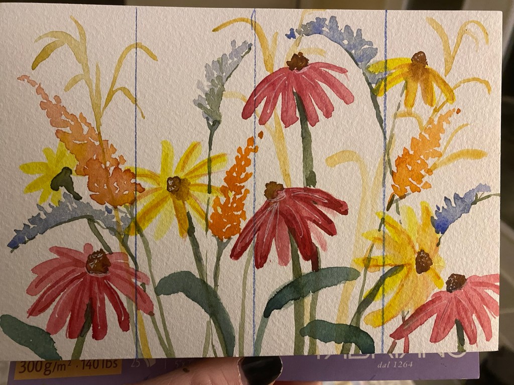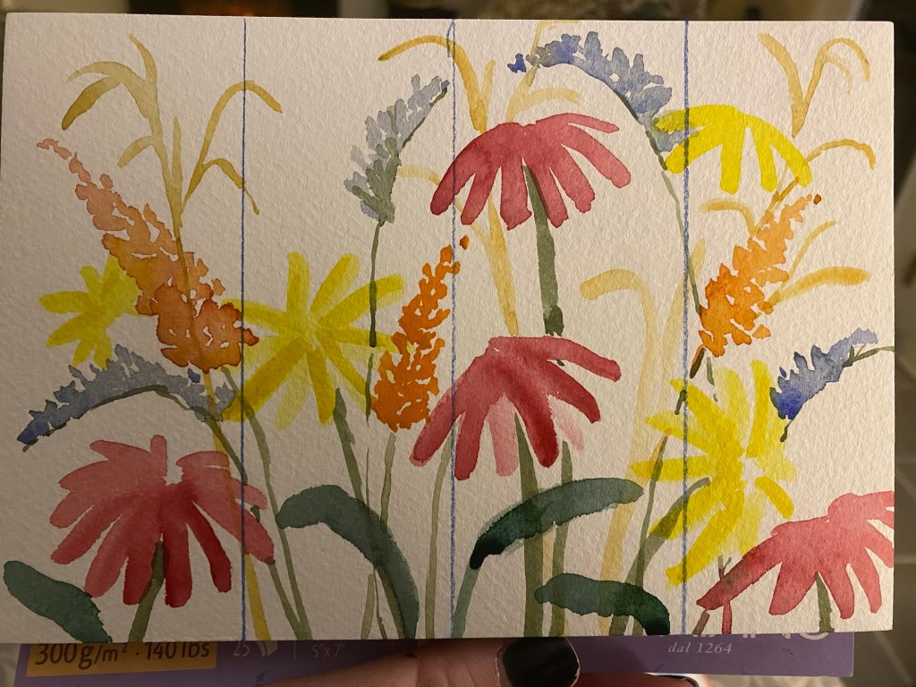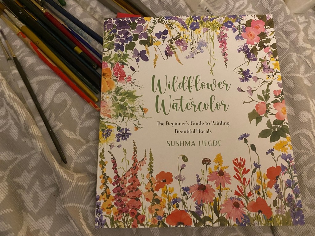 Inspired by the book “Wildflower Watercolor” by Sushma Hegde, I decided to try and paint a bouquet. I’m not the best at painting flowers, but I liked this book’s style. The flowers in the demonstrations are not super realistic looking, and I’d rather try to represent a feeling than a portrait.