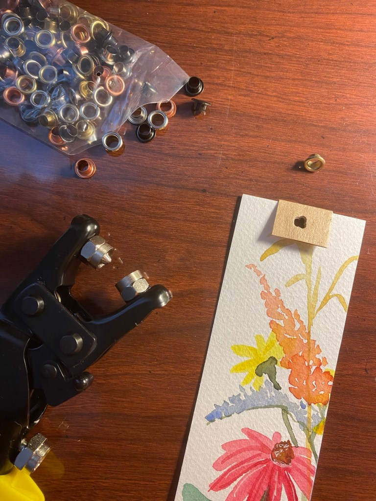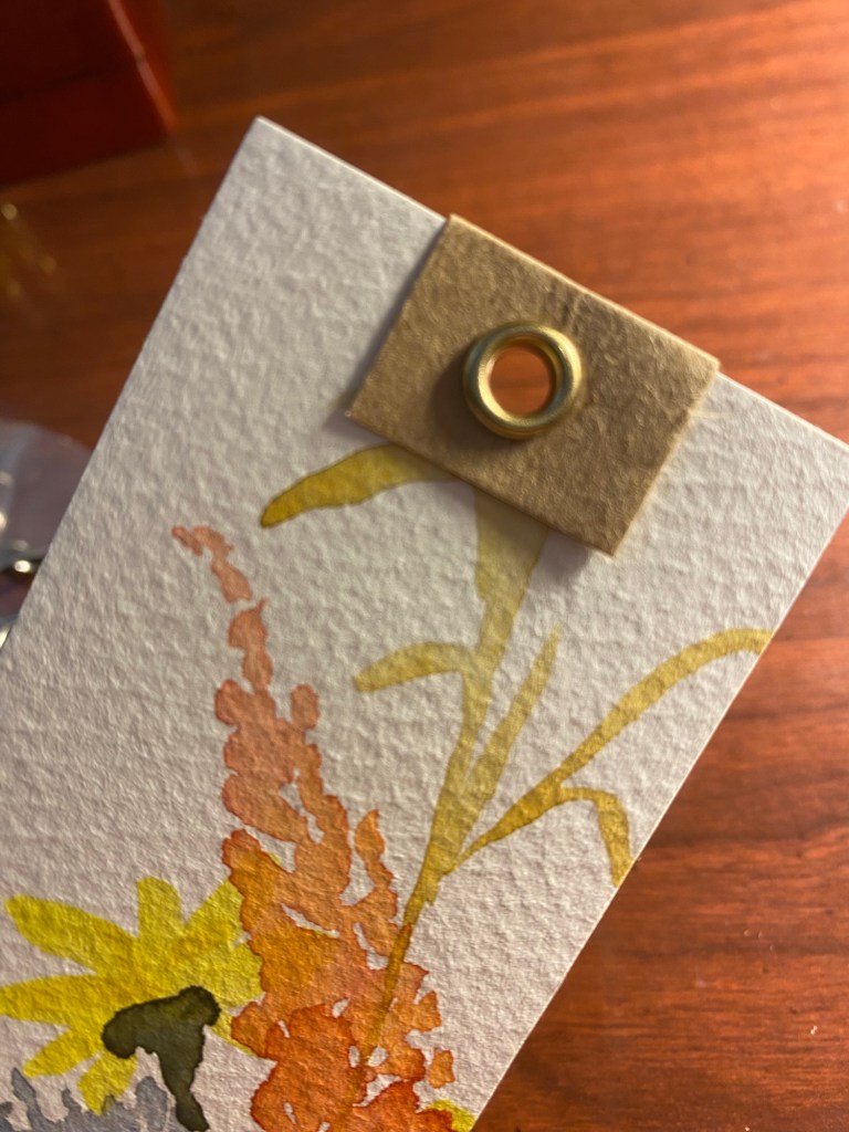 In this picture, I wanted to fasten the bookmark with a grommet to protect the hole. To do this, I needed to add some brown cardstock to reinforce the watercolor paper because the grommet, as small as it is, is rather thick.